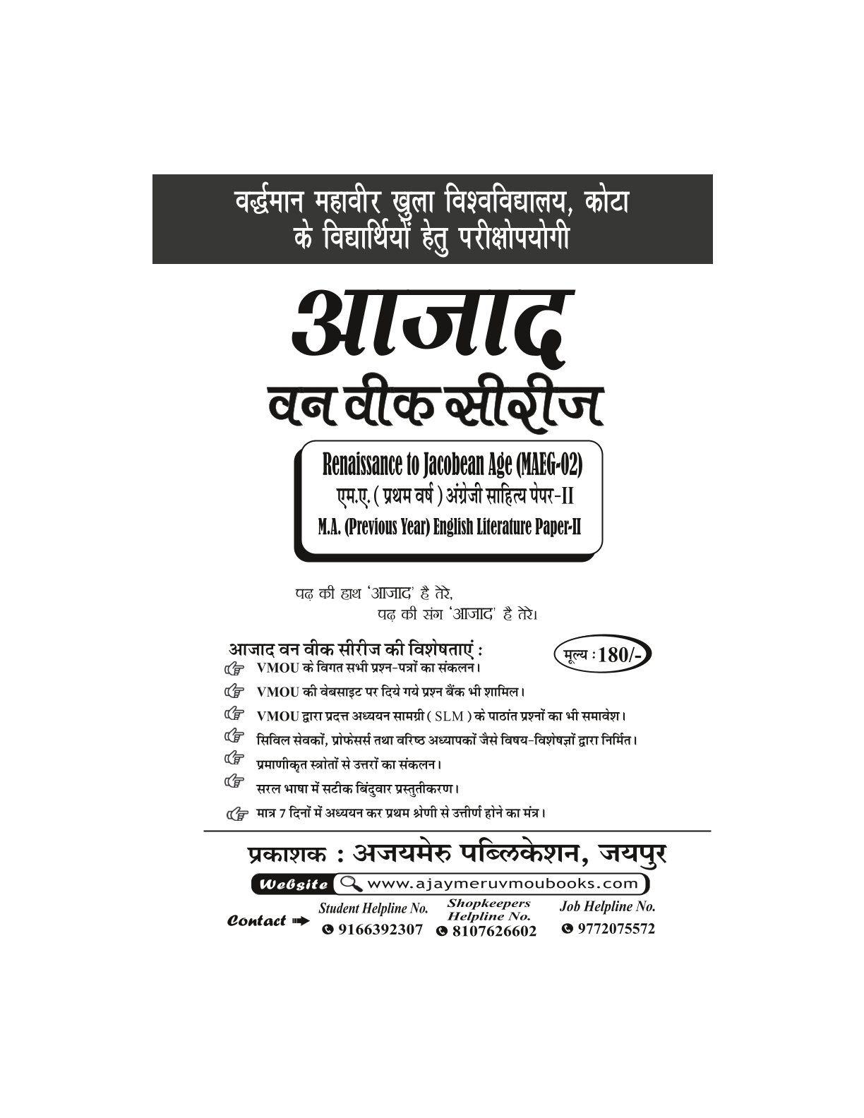 यह VMOU कोटा के M.A इंग्लिश फर्स्ट ईयर के MAEG-02 पेपर की वन वीक सीरीज है जो की नई सेमेस्टर प्रणाली पर आधारित है इस सीरीज में VMOU कोटा के Old Question Paper असाइनमेंट के प्रश्न, SLM के सभी प्रश्न समाहित है ! आगामी परीक्षा में यह आपके लिए बेहद उपयोगी सिद्ध होगी!