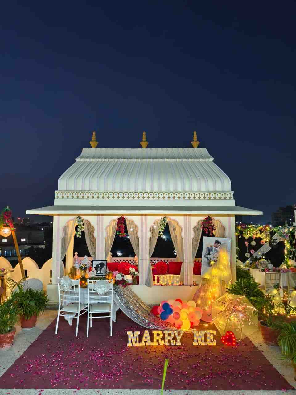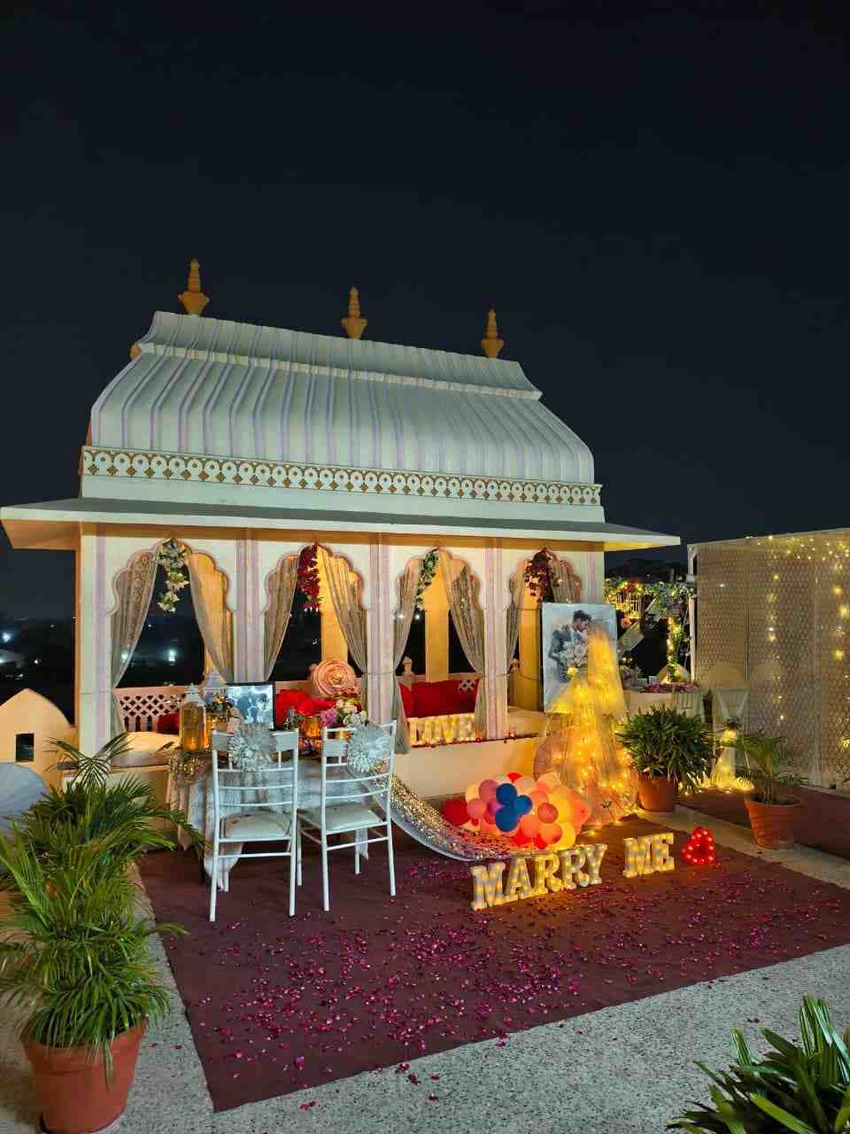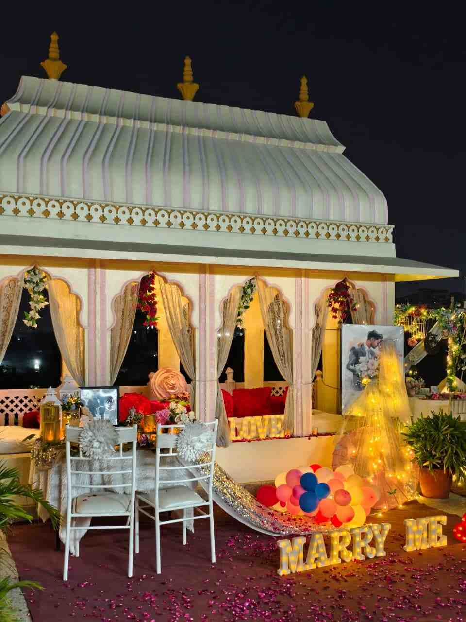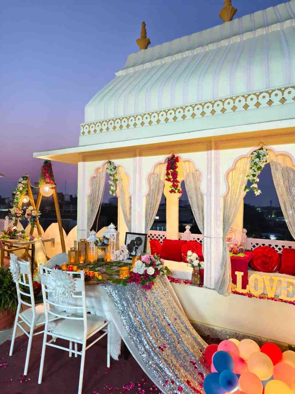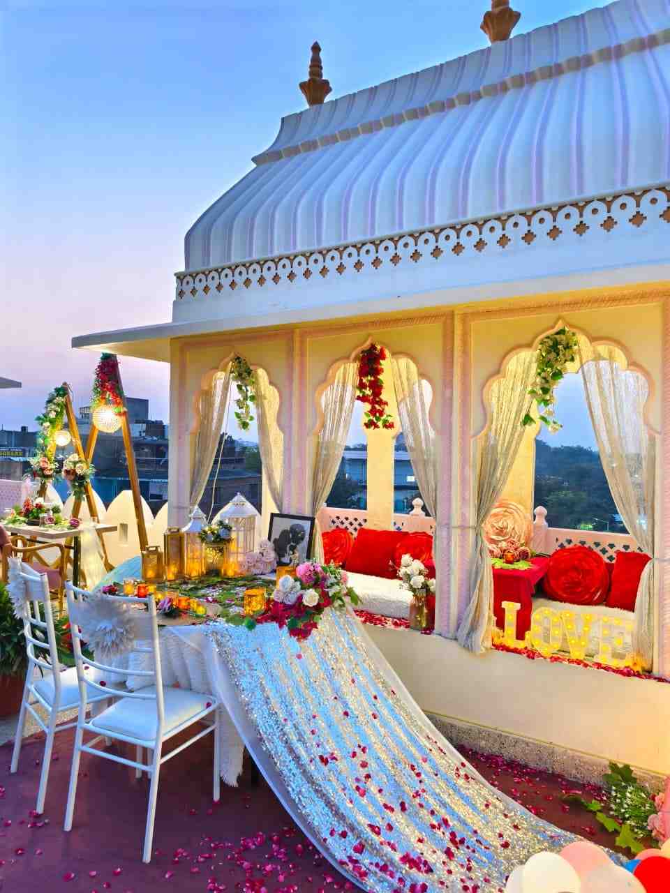 : The traditional Baradari takes on a new charm, adorned with lacy curtains, Bougainvillea flowers, and fresh rose petals.