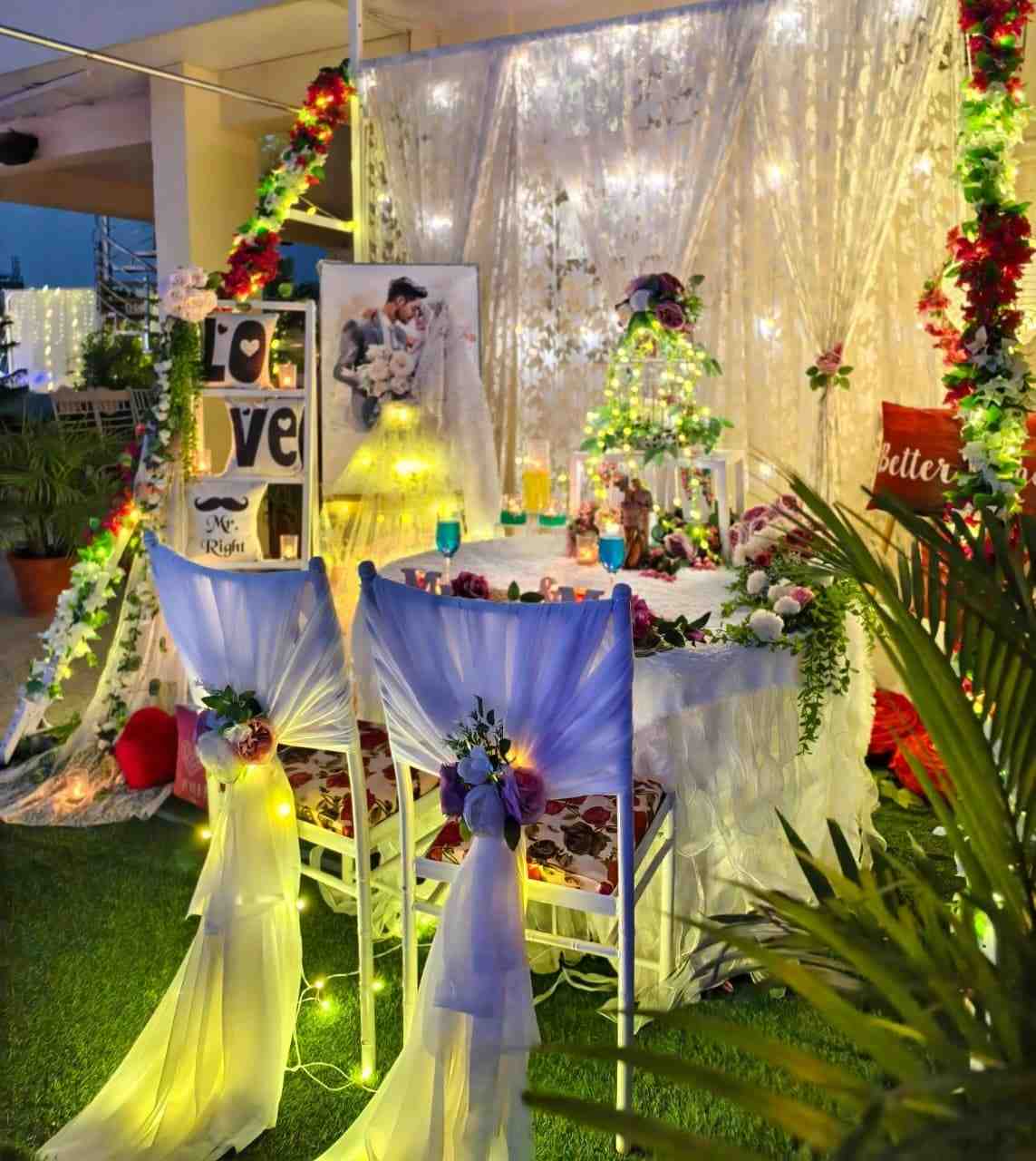- Flickering candles in a starry night with a round table and chair with chair sashes in a rooftop garden