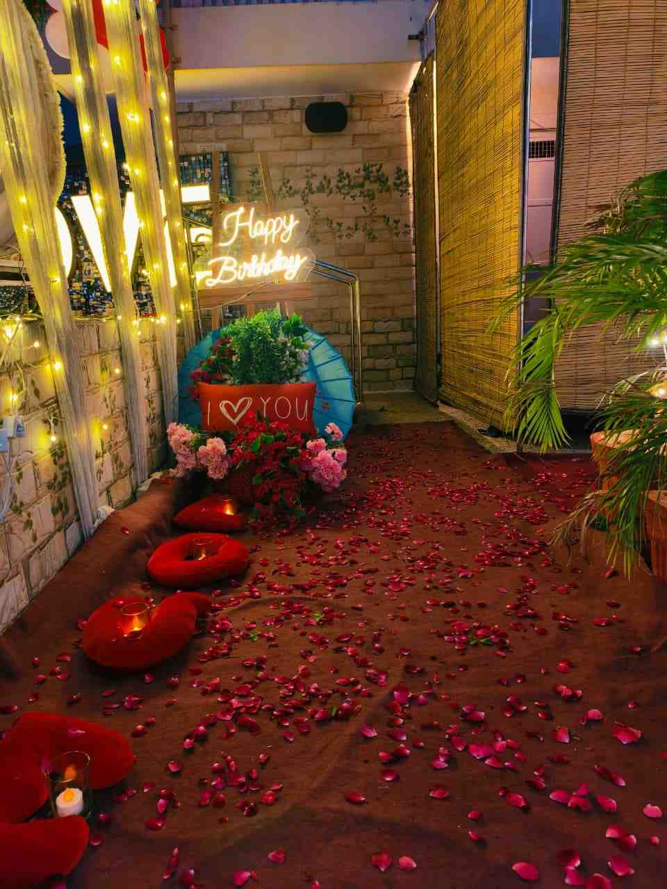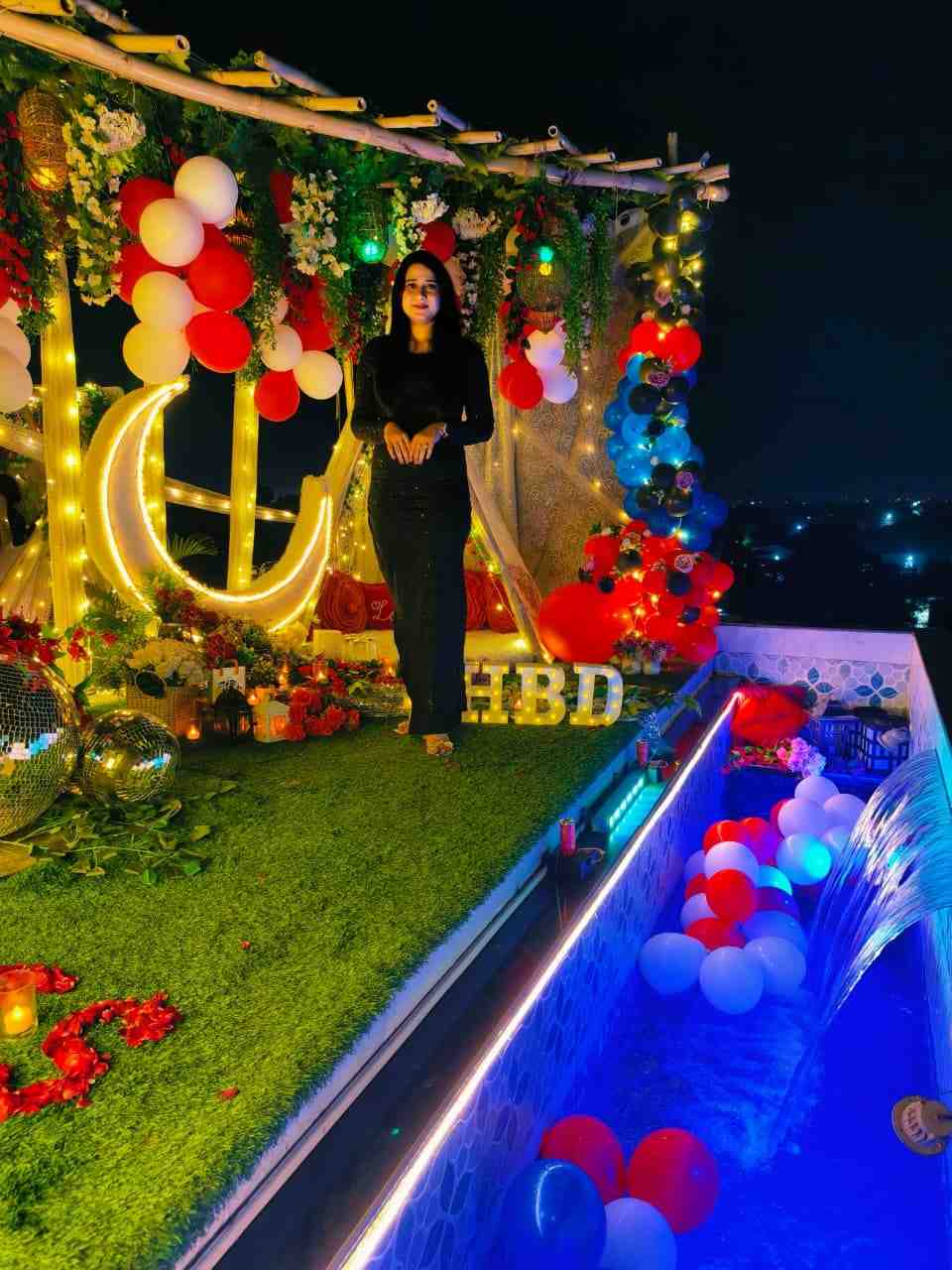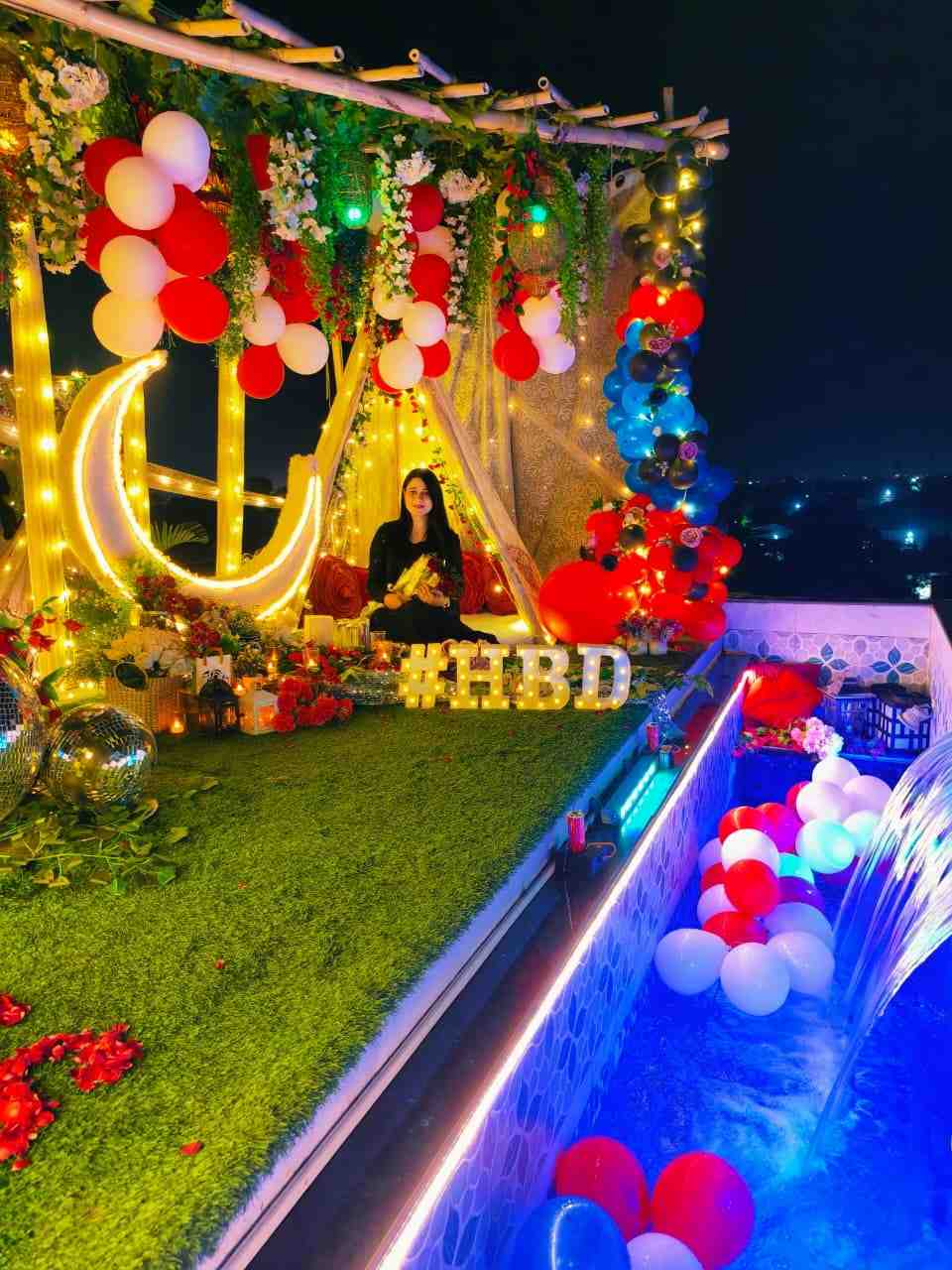 This setup is inclusive of food & decoration . This is a private setup on upper deck level of rooftop with direct view of Nahargarh fort and couple pool