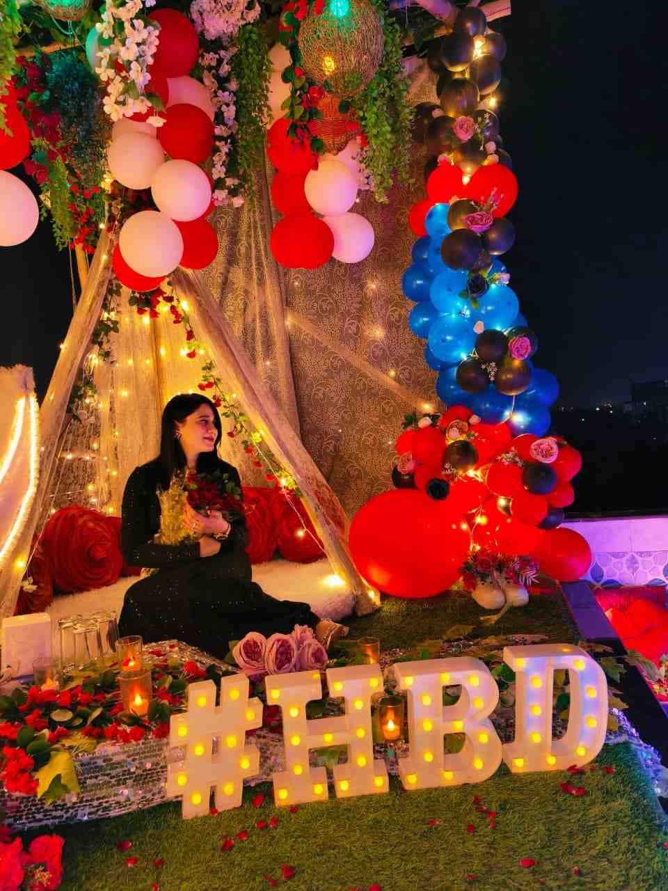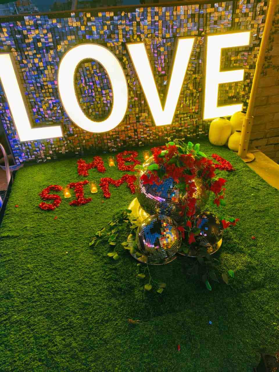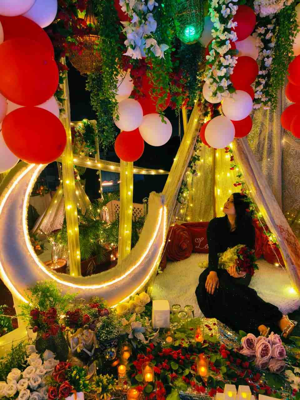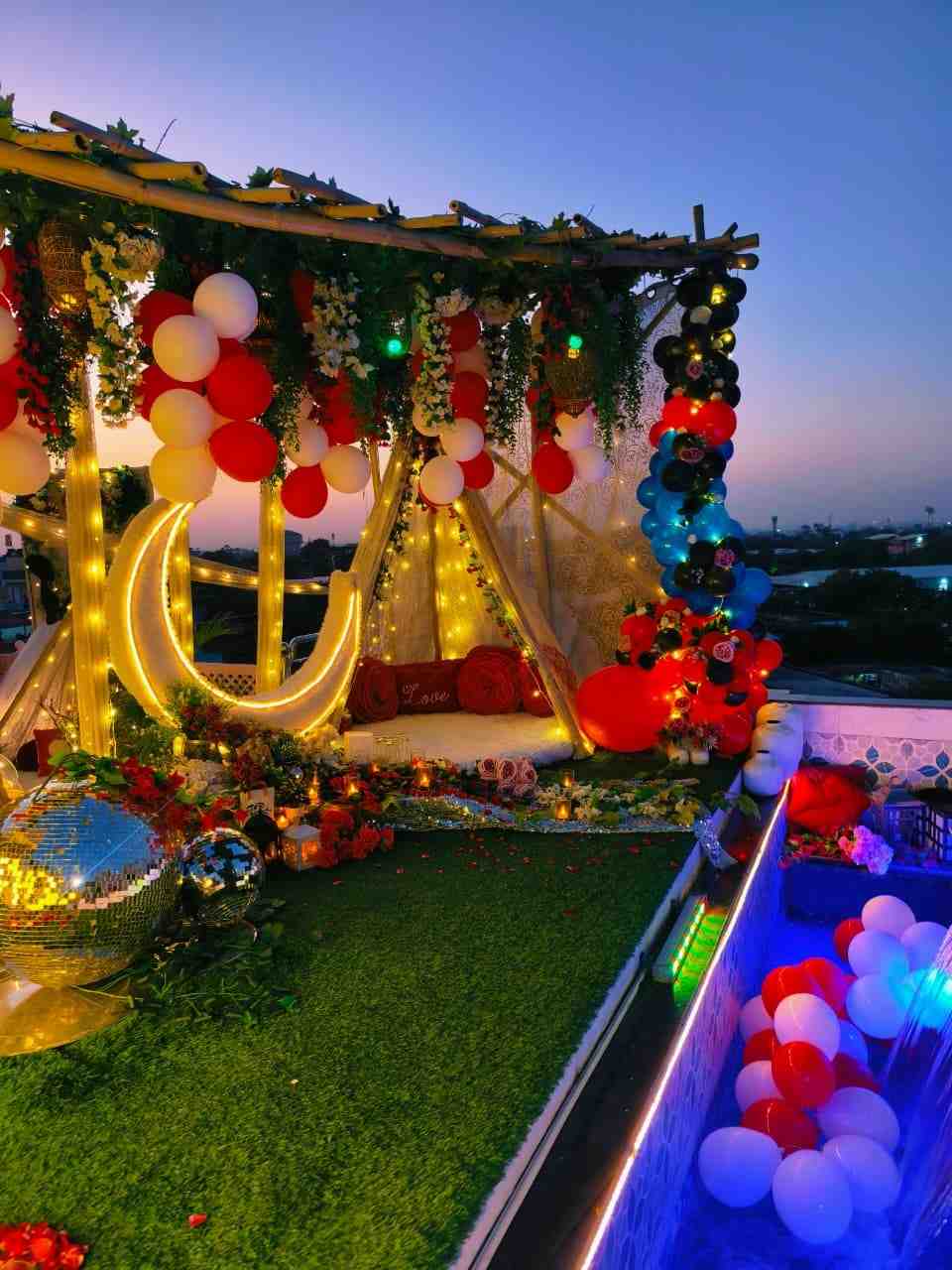 This setup is inclusive of food & decoration . This is a private setup on upper deck level of rooftop with direct view of Nahargarh fort and couple pool